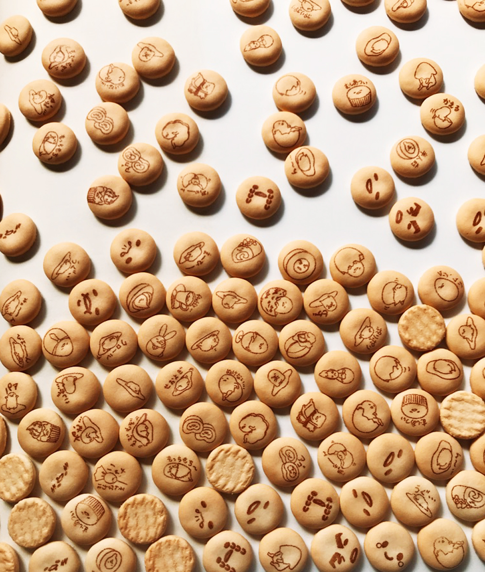 ●丸いビスケットに様々なポーズがプリントされており、デザインは全81種。そのうち1種は、1/324の確率で出会える「ニセたまさん」。見つけた人はラッキー!