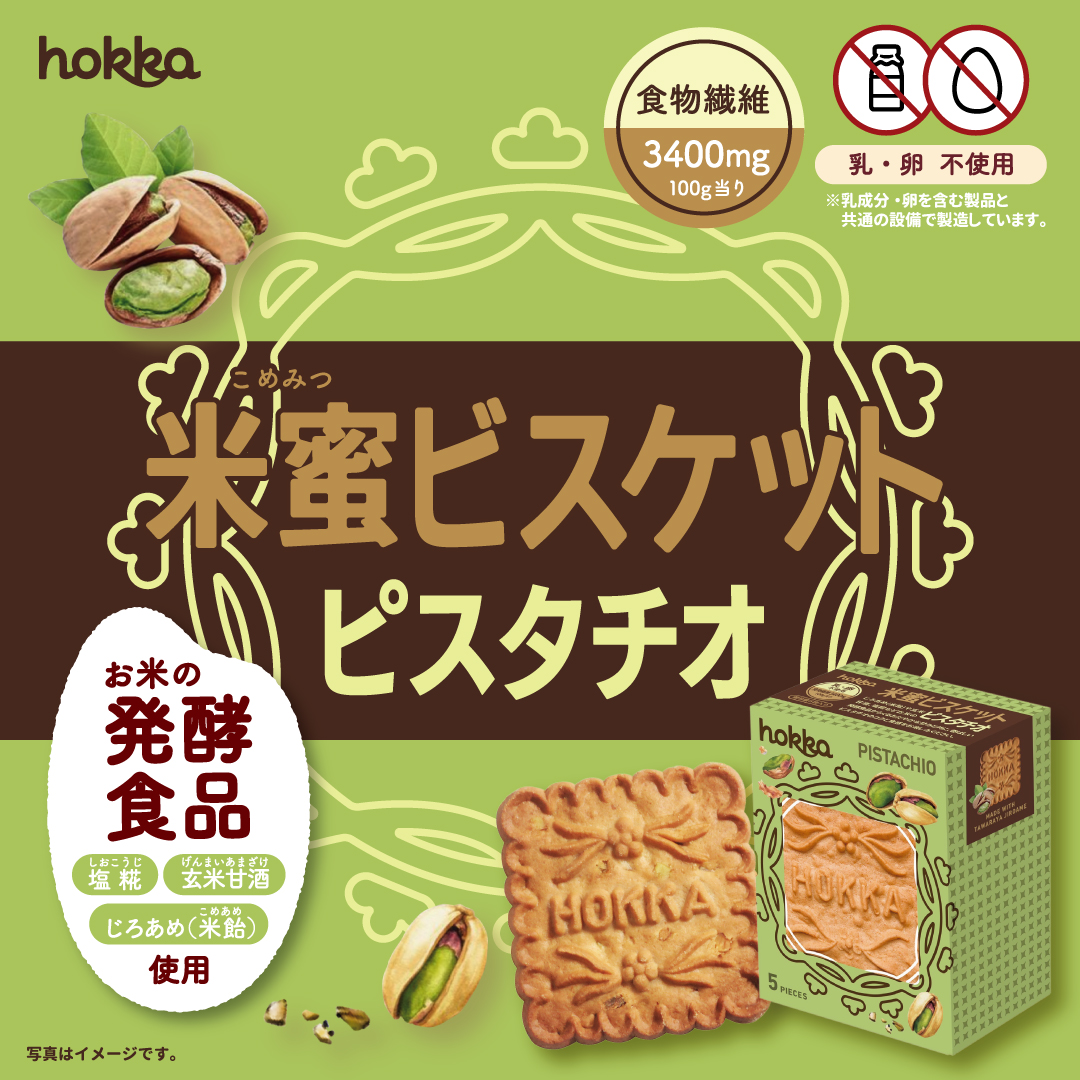 金沢伝統の味、俵屋のじろあめを使用し、てんさい糖、じろあめ(米飴)、玄米甘酒からくるおだやかな甘味の自然派ビスケット「米蜜ビスケット」シリーズのピスタチオ味です。