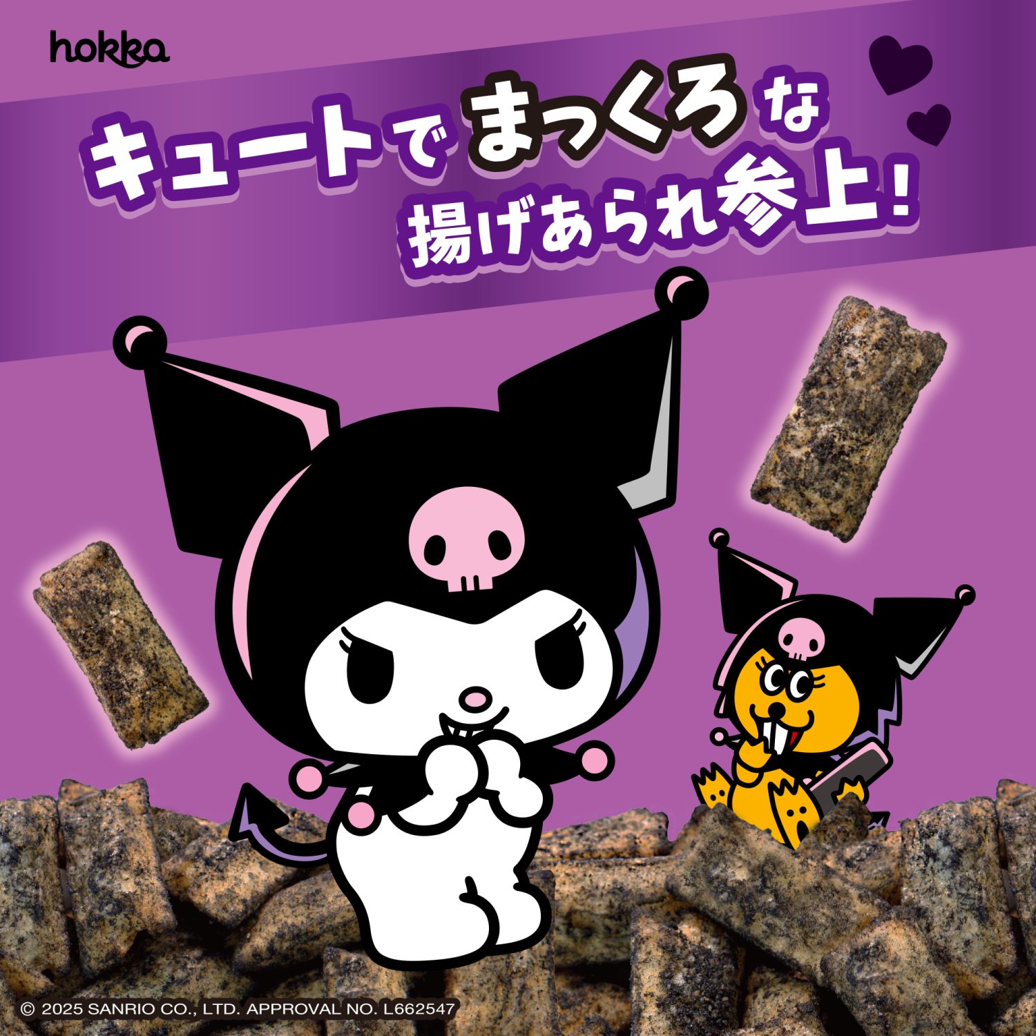 クロミのように黒色になった揚げあられは、クロミの好物であるらっきょう風味です。