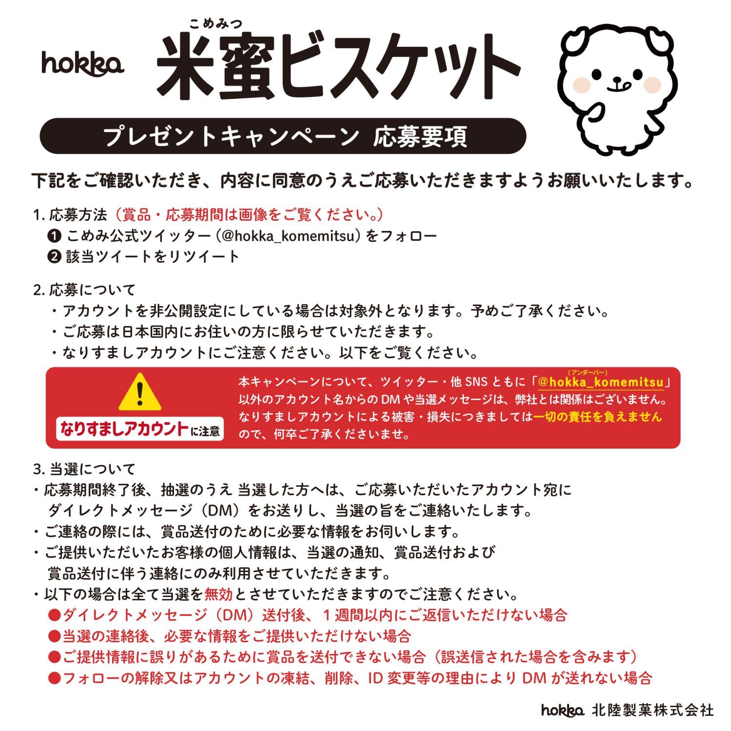 なりすましアカウントにご注意ください。「@hokka_komemitsu」以外のアカウント名以外からのDMや当選メッセージは、弊社とは関係ございません。なりすましアカウントによる被害・損失につきましては一切の責任を負えませんので、何卒ご了承ください。