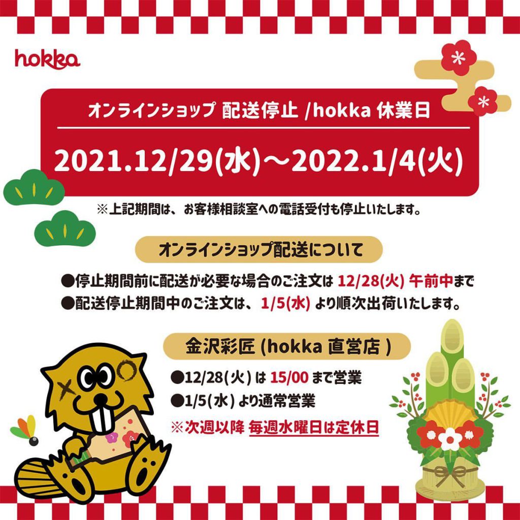 hokkaオンラインショップ配送業務 および 直営店「金沢彩匠」をお休みとさせていただきます。