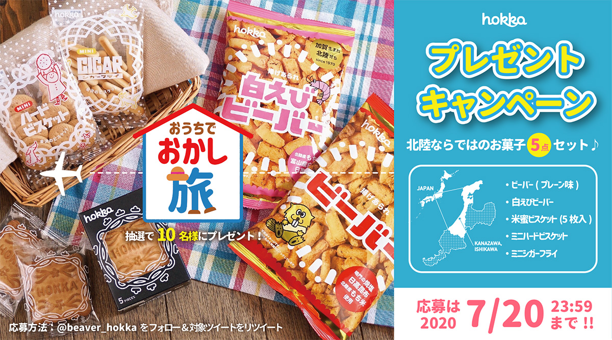 期間中に応募された方のうち、ビーバーや米蜜ビスケットなど、北陸ならでは!のお菓子5点セットを、抽選で10名様にプレゼント!