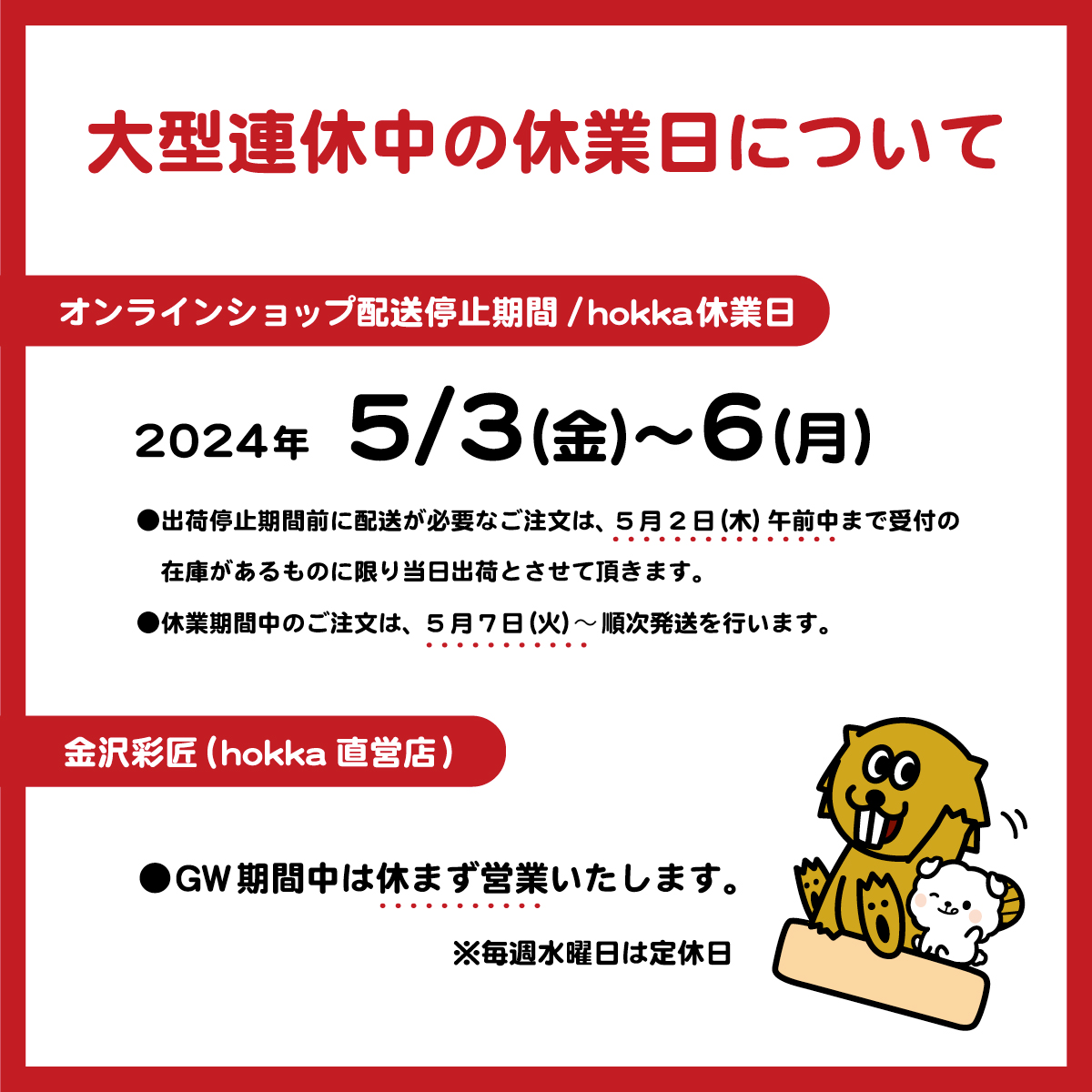 誠に勝手ながら、5月3日(金)〜6日(月)の間 オンラインショップの配送を停止させていただきます。