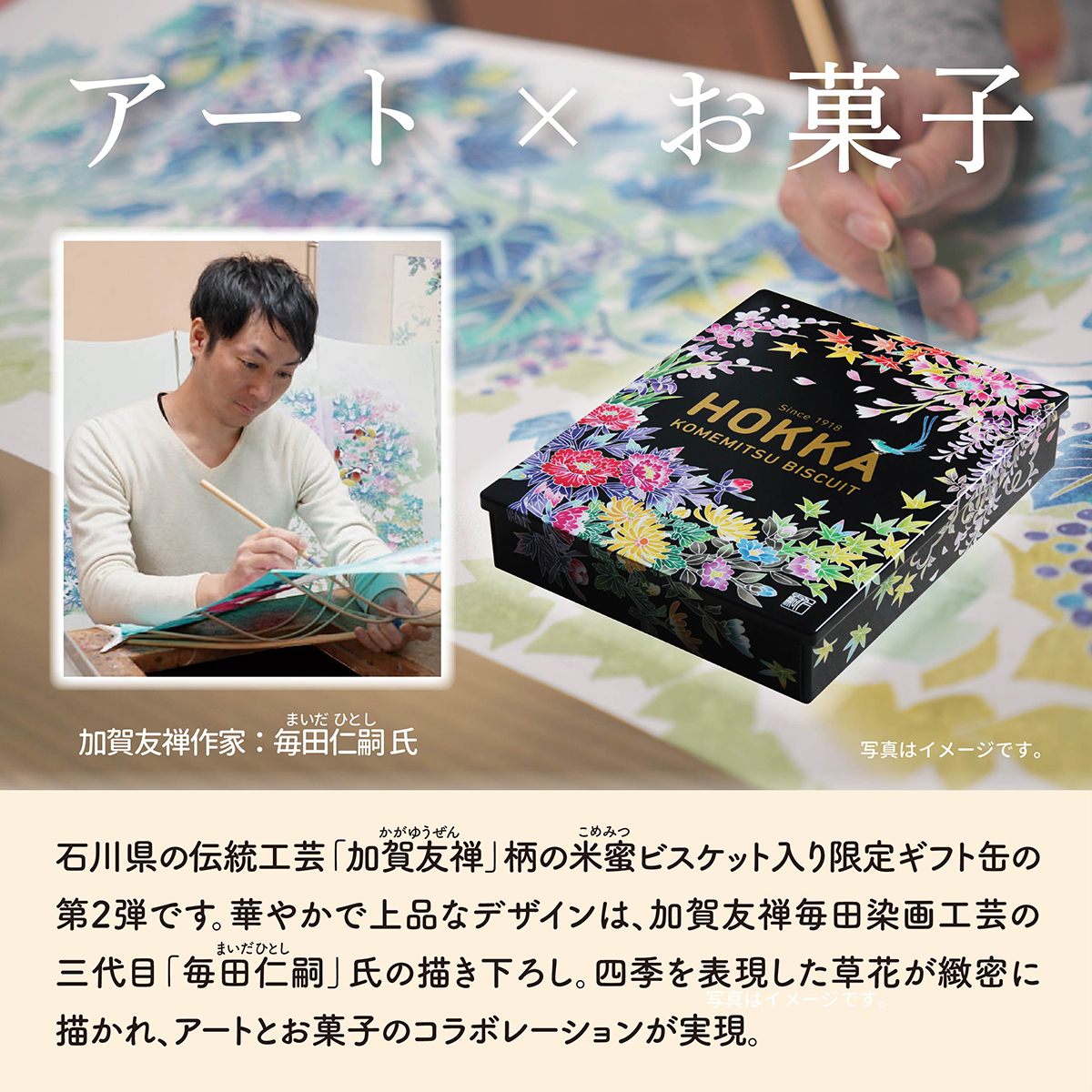 缶は、加賀友禅作家 毎田仁嗣 氏による描き下ろしデザイン。