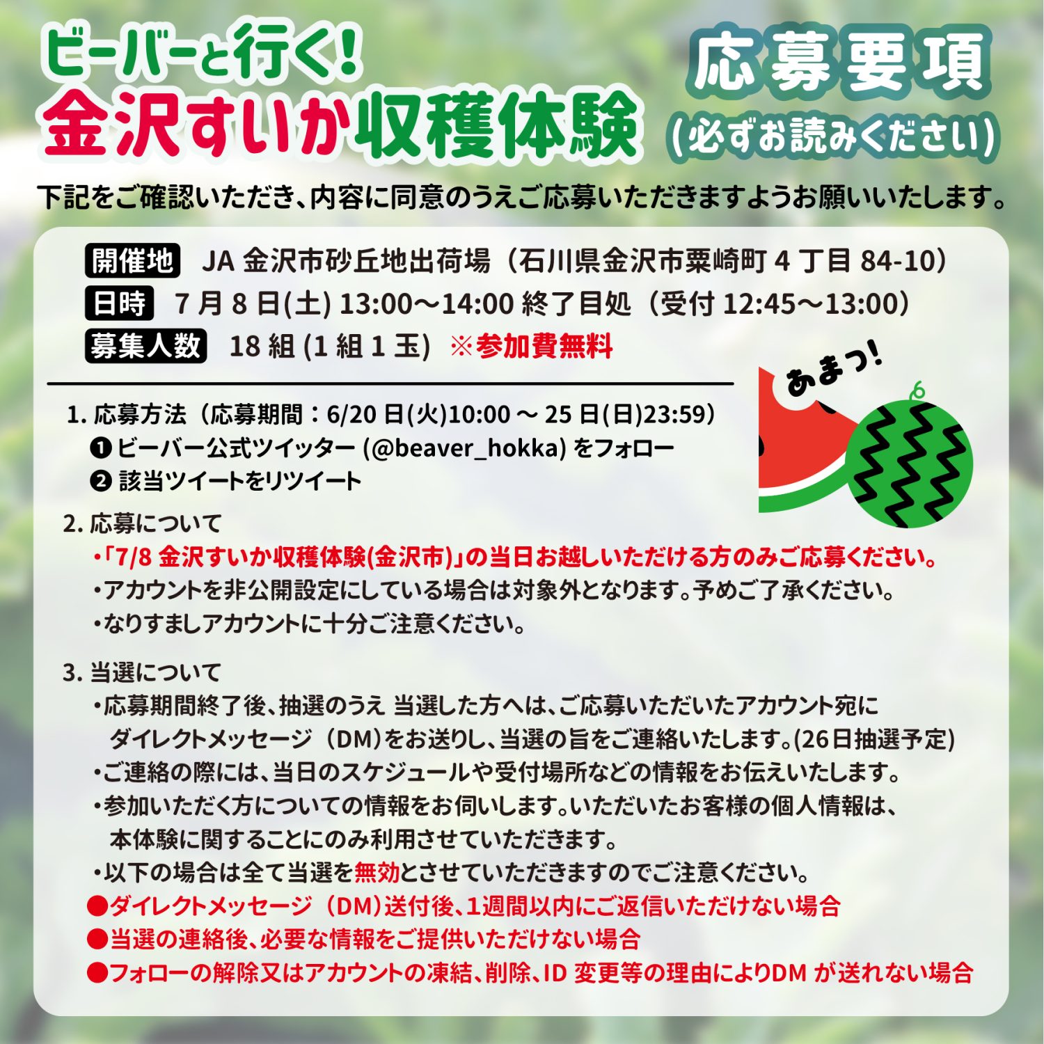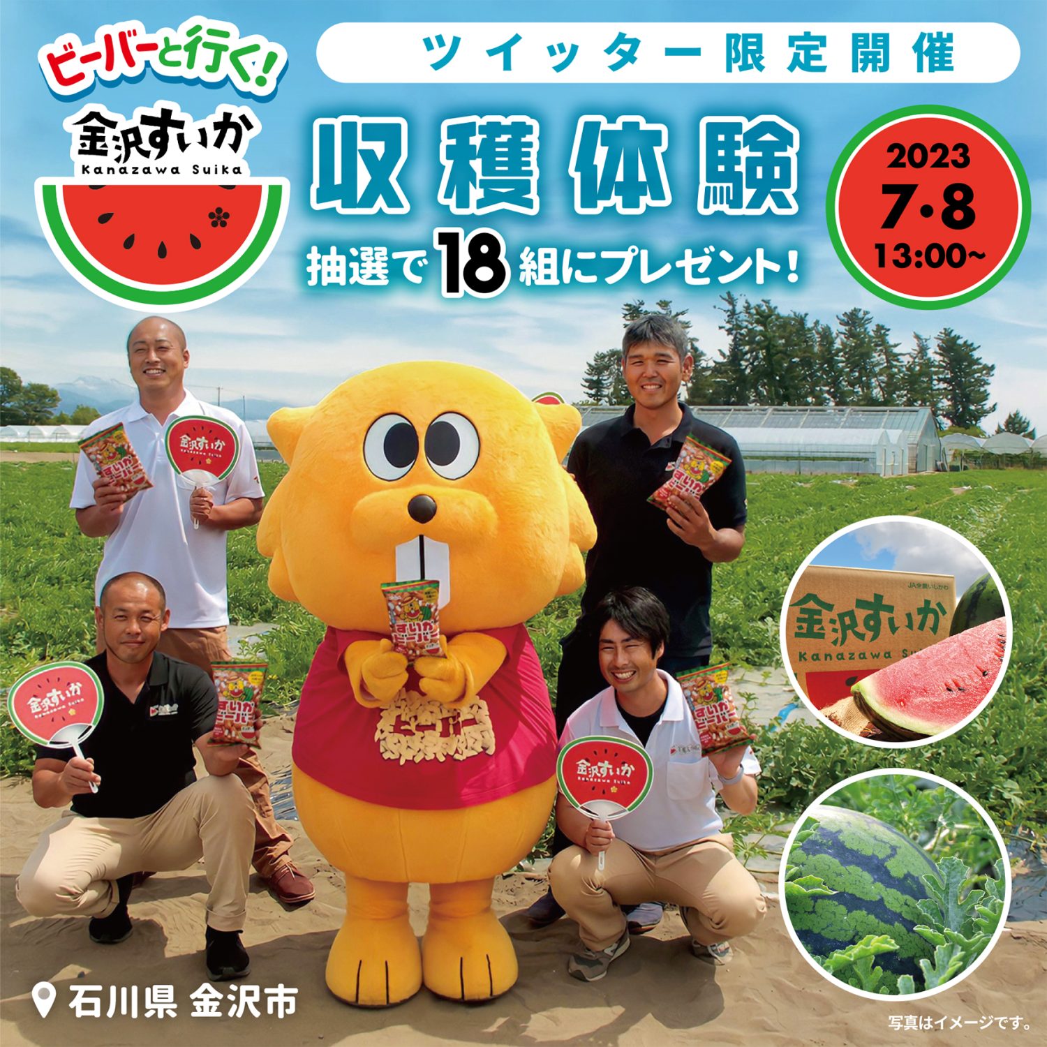 【終了】7/8(土)「ビーバーと行く!金沢すいか収穫体験」が当たる!ツイッターキャンペーン開催