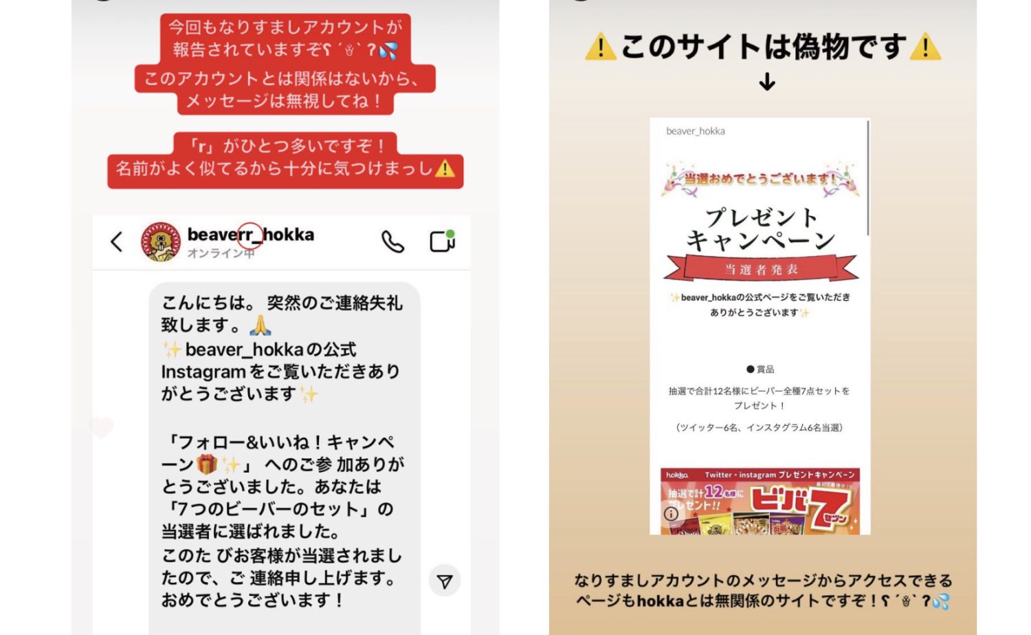 よく似たアカウント名で当選を装ったメッセージを送っている事案が多数報告されています。